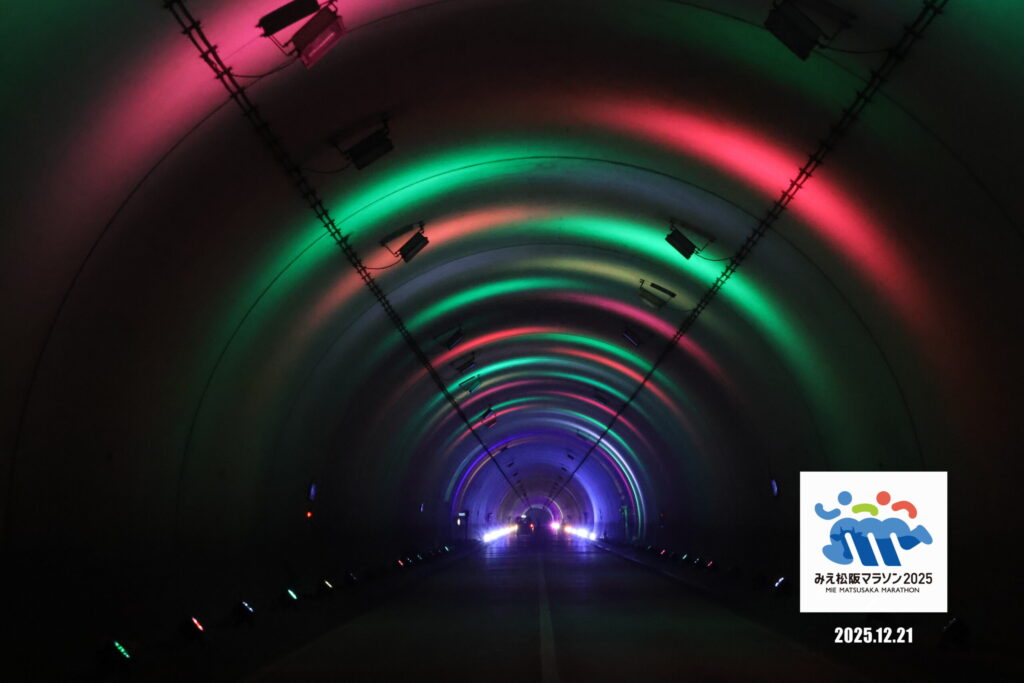 みえ松阪マラソンの魅力は、松阪牛のサイコロステーキをはじめとして、充実したエイドステーションを堪能できることと、苦しくなってくる32km地点のトンネル内で、幻想的なプロジェクションマッピングを楽しみながら走れることです。