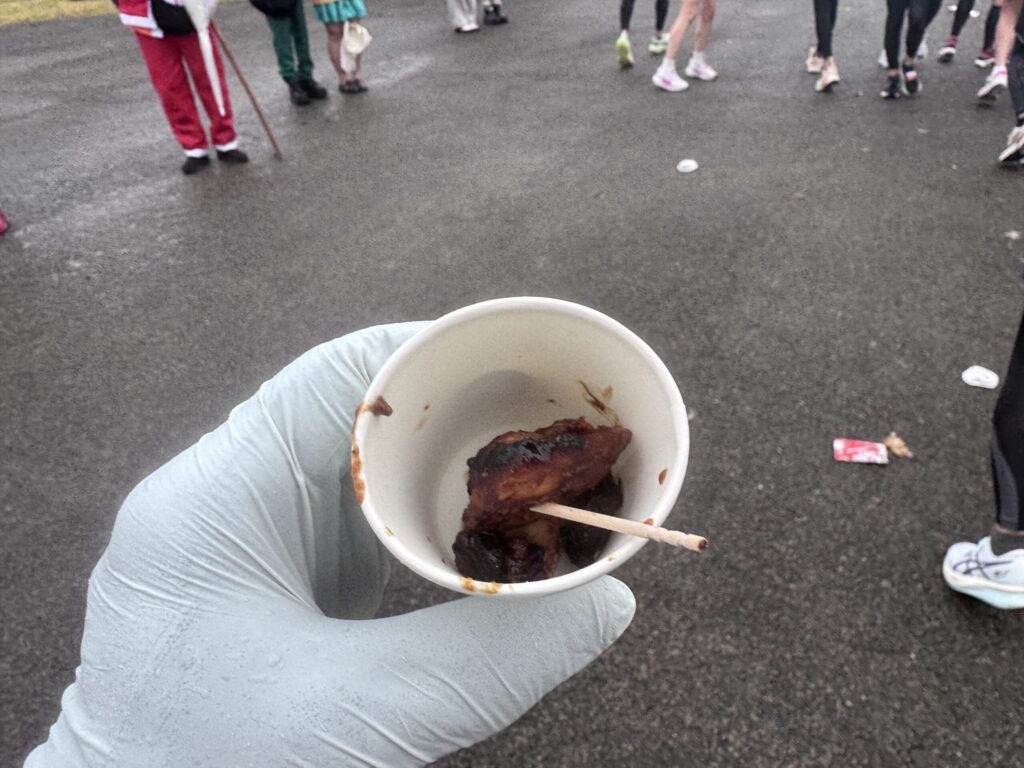 雨の中を走っていると、24km地点でお楽しみの「松阪牛サイコロステーキ」が現れました。