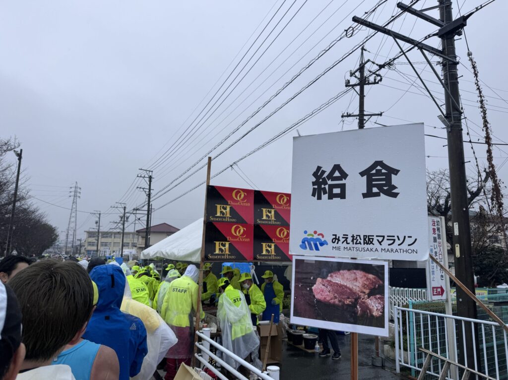 名物の「松阪牛サイコロステーキ」をはじめ、給食エイドが絶妙なタイミングで現れるため、雨の中でも楽しく走るモチベーションになりました。