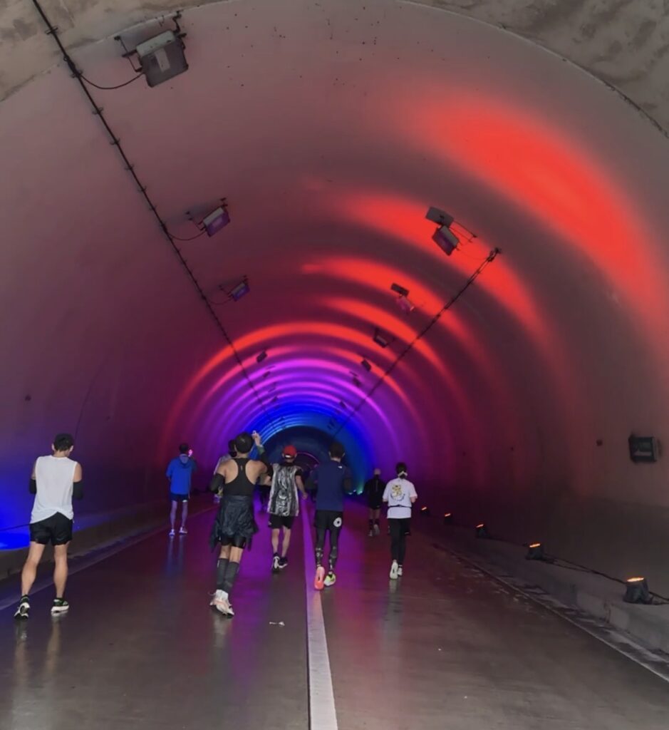 一つ目のトンネルの厳しい上り坂を上り切り、二つ目のトンネルが大会名物のイルミネーションです。