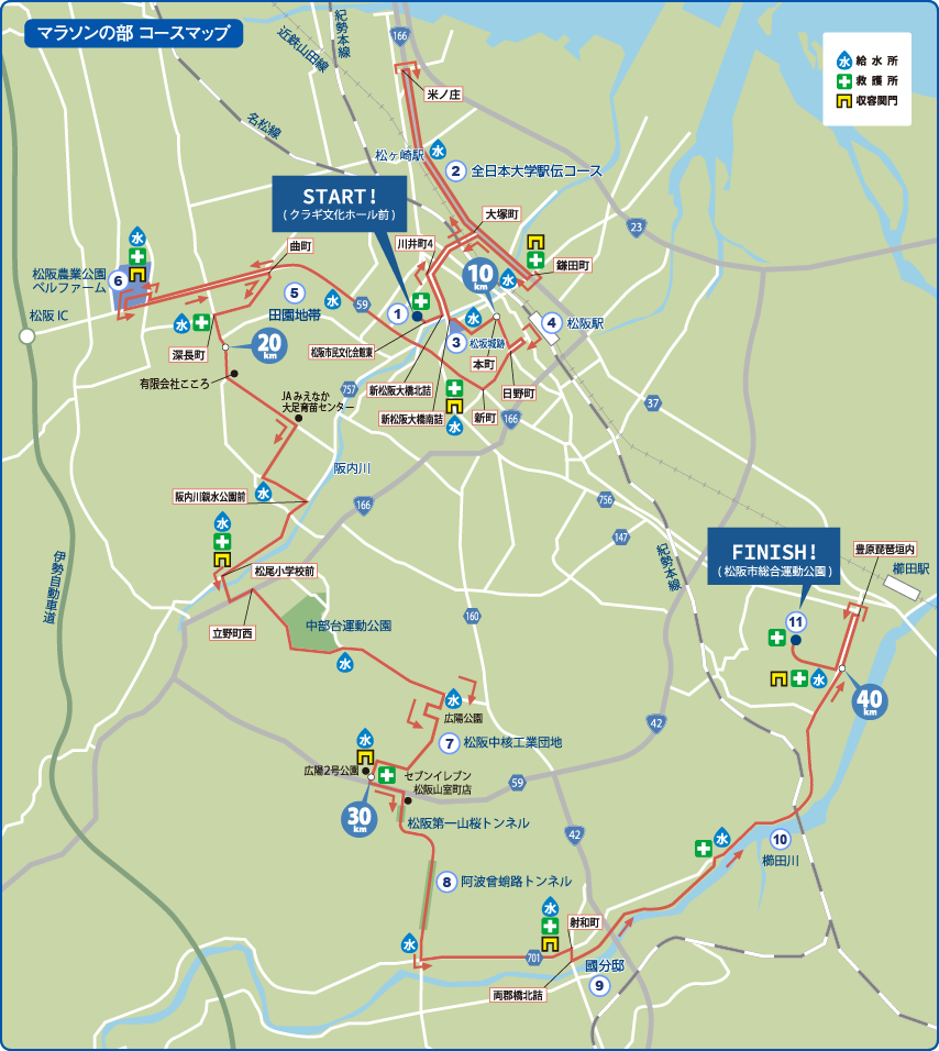 11km前後の松阪駅前が、この大会で一番沿道の応援が多いスポットなので、応援から元気をもらいつつも、オーバーペースには気をつけましょう。