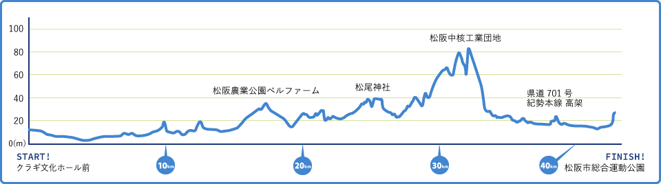 最初の給食エイドがある16.5km地点の松阪農業公園ベルファームまでは、やや上り基調が続きますので、ペースが多少落ちても気にしすぎないようにしましょう。